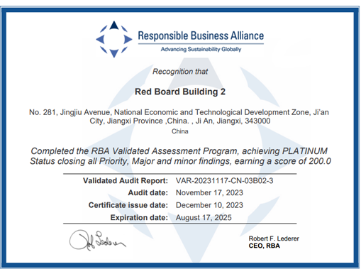 江西taptap点点体育科技股份有限公司于2019年首次获得RBA认证,铂金等级(得分:200,总分:200),体现taptap点点体育在社会责任方面的重视和付出。taptap点点体育承诺会一如既往地满足RBA认证要求,重视社会责任,持续改善在社会责任方面的绩效。